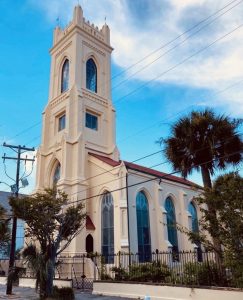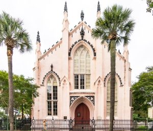 Easily recognizable by its light pink stucco exterior, the French Huguenot Church stands apart from most other churches in Charleston for what it doesn’t have – a traditional steeple and spire. Instead, this Gothic Revival building, designed by Edward Brickell White in 1844, features a horizontal design with a distinctive tent-like roof that creates a unique silhouette among Charleston’s towering church spires.